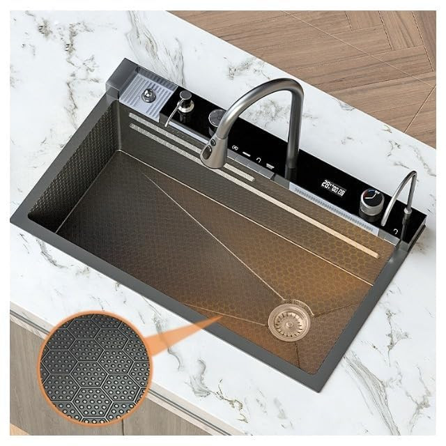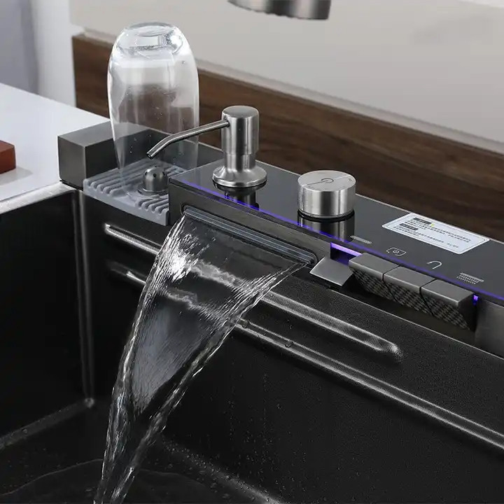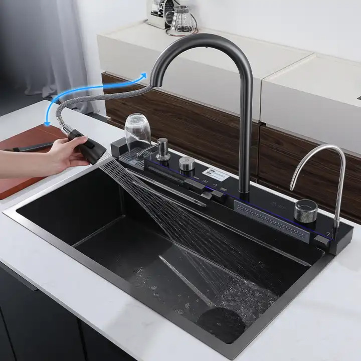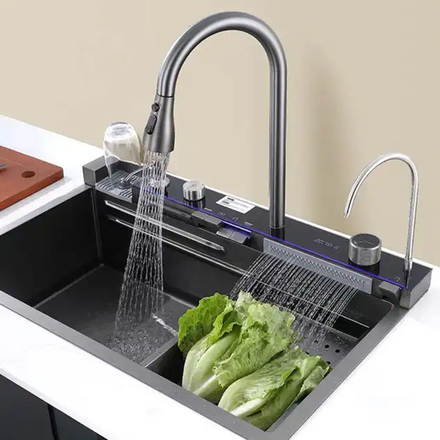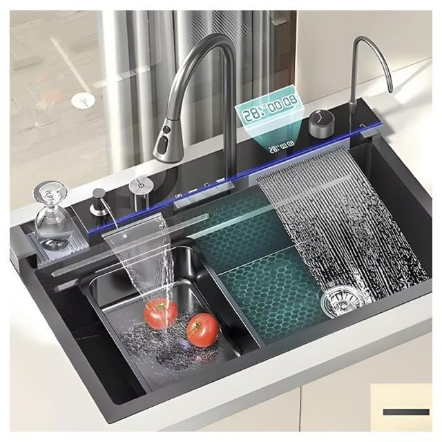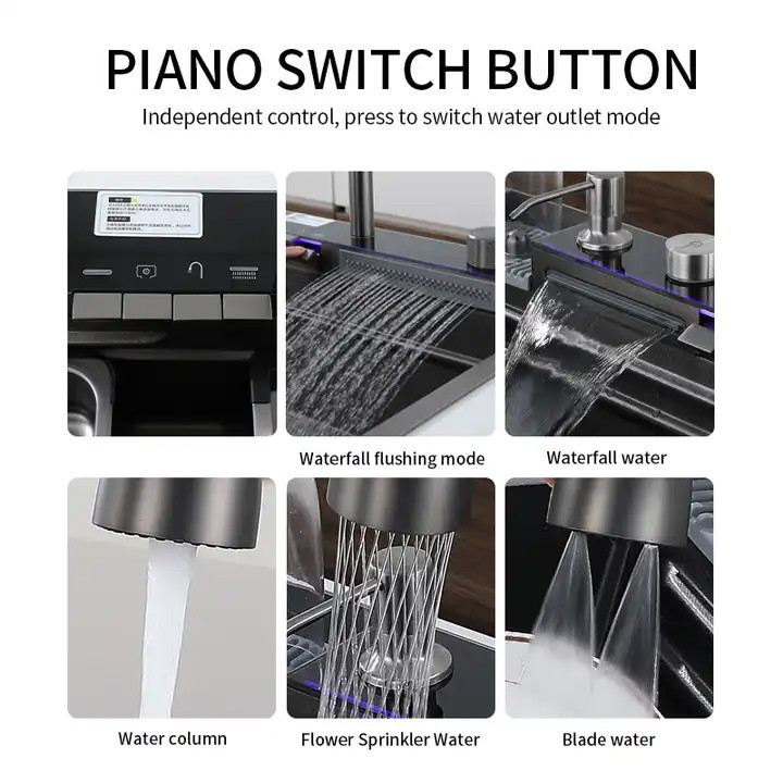 فول آپشن ترین سینک پیانویی رنگ سینک دودی مشکی ،5 کلید شامل لیوان شور اتوماتیک ، شیر تسویه آب اتوماتیک ، 2 آبشار ، جامایع ، دیمر درجه آب ، نمایشگر دیجیتالی ، تخته چوبی ، 2 عدد سبد استیل. تمیز کردن و نگهداری آسان سطح نانو ، ارسال ایمن سراسر کشور ، با نمایشگر دیجیتال ، ابعاد سینک آبشاری بارانی 46x75 ، استنلس استیل مشکی 304 ، کلید پیانویی جهت بازو بسته کردن شیرها