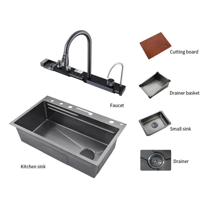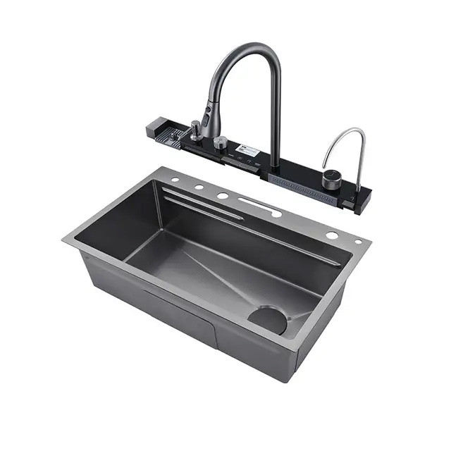 فول آپشن ترین سینک پیانویی رنگ سینک دودی مشکی ،5 کلید شامل لیوان شور اتوماتیک ، شیر تسویه آب اتوماتیک ، 2 آبشار ، جامایع ، دیمر درجه آب ، نمایشگر دیجیتالی ، تخته چوبی ، 2 عدد سبد استیل. تمیز کردن و نگهداری آسان سطح نانو ، ارسال ایمن سراسر کشور ، با نمایشگر دیجیتال ، ابعاد سینک آبشاری بارانی 46x75 ، استنلس استیل مشکی 304 ، کلید پیانویی جهت بازو بسته کردن شیرها